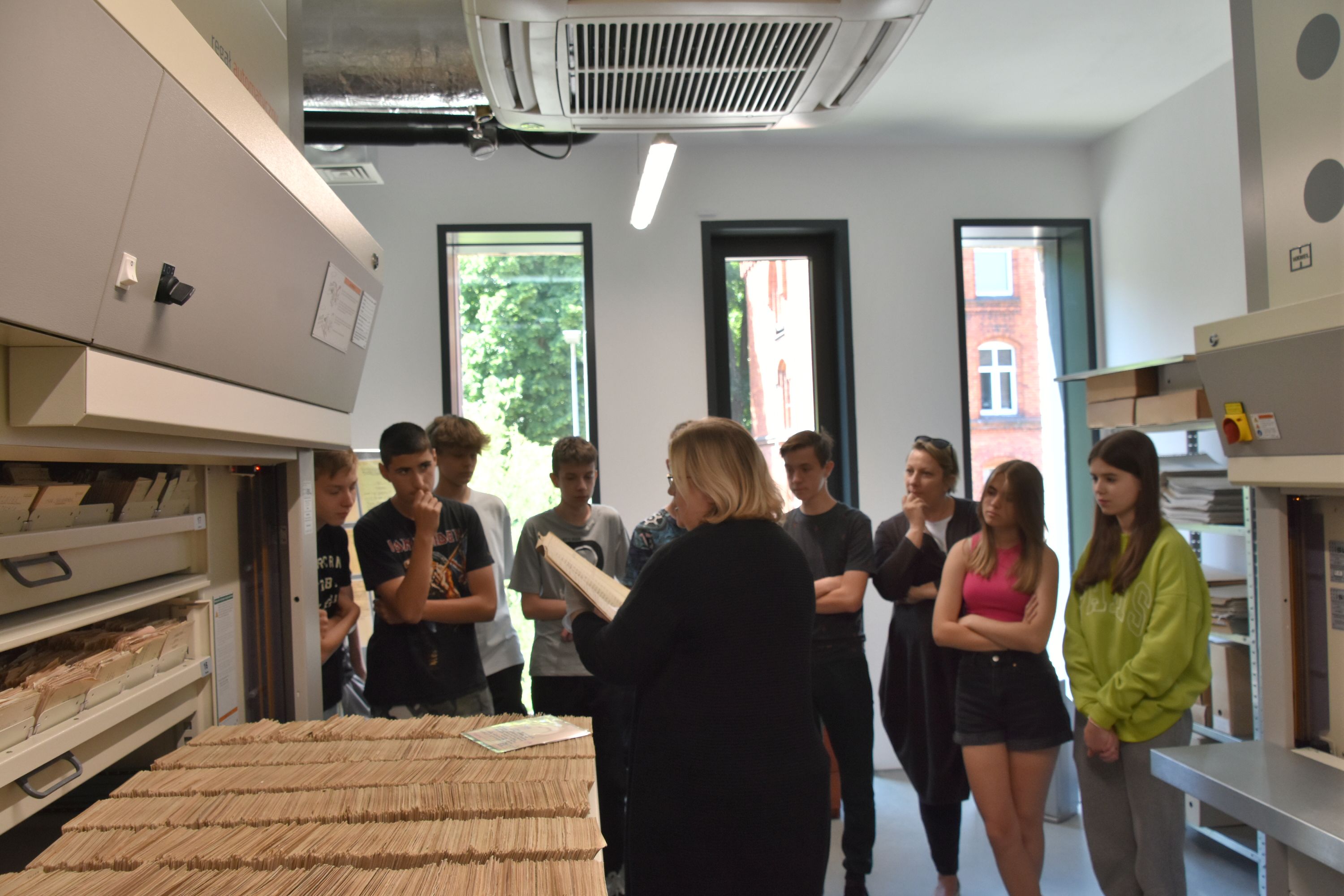 Pracownicy Wydziału Archiwalnego: Anna Jakubowska, Justyna Kęska, Karolina Marciniak i Mateusz Szłapka, zapoznali uczniów ze specyfiką swojej pracy, w tym z poszczególnymi procesami, jakim podlegają materiały archiwalne w archiwum (gromadzenie, ewidencjonowanie, opracowywanie, przechowywanie, konserwacja, udostępnianie, digitalizacja). Uczestnikom zwrócono uwagę na różnorodność zgromadzonej dokumentacji ze względu na postać fizyczną, rodzaj dokumentacji oraz instytucje przekazujące materiały archiwalne. Całość zajęć uzupełniono prezentacją najciekawszych, a także nietypowych archiwaliów znajdujących się w archiwum Wydziału.
