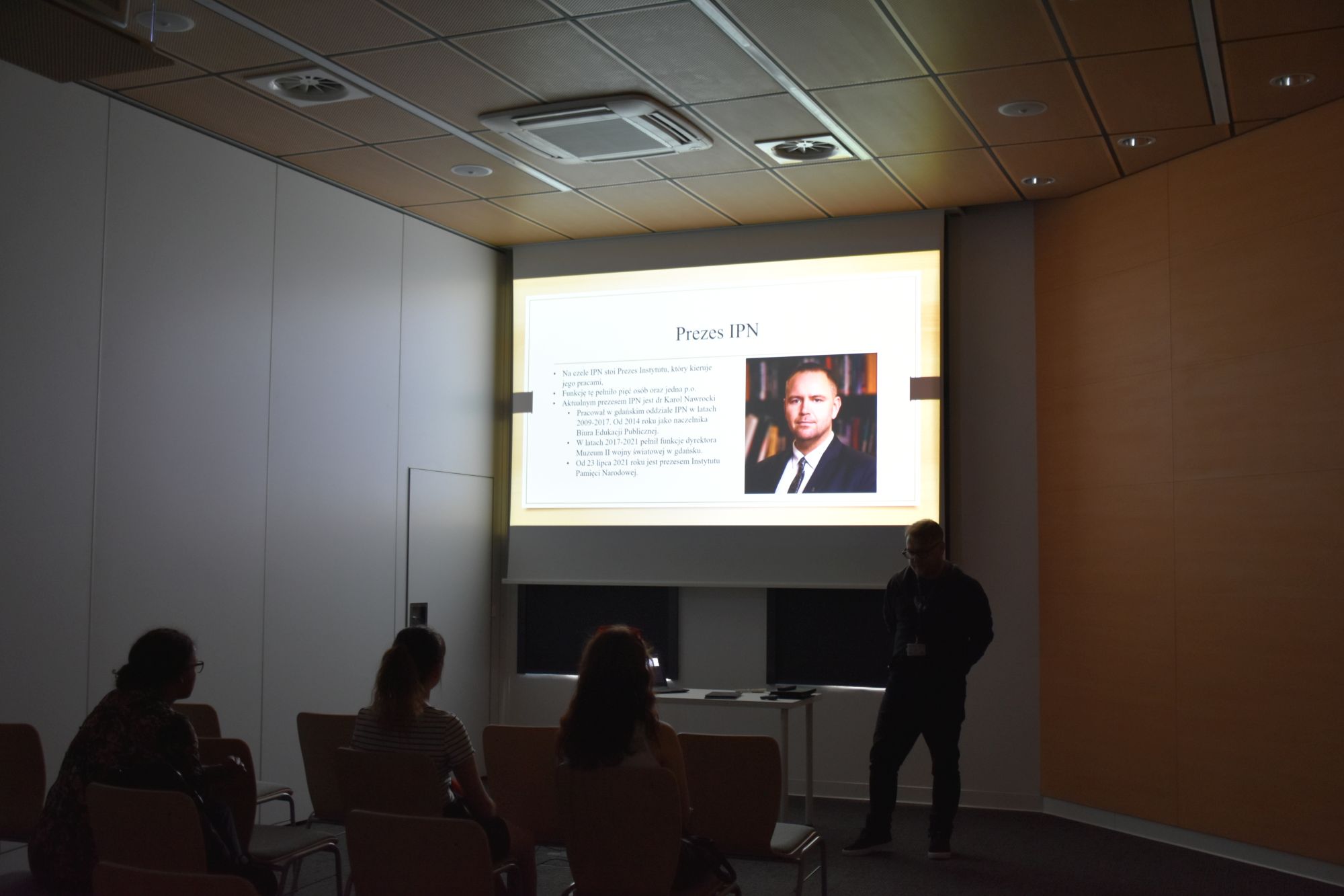 Studentki wysłuchały prelekcji Mateusza Szłpaki na temat organizacji i działalności Instytutu Pamięci Narodowej. Następnie zapoznały się ze specyfiką pracy Wydziału Archiwalnego, w tym z poszczególnymi procesami jakim podlegają materiały archiwalne w archiwum (gromadzenie, ewidencjonowanie, opracowywanie, przechowywanie, konserwacja, udostępnianie, digitalizacja). Uczestnikom zwrócono uwagę na różnorodność zgromadzonej dokumentacji ze względu na postać fizyczną, rodzaj dokumentacji oraz instytucje przekazujące materiały archiwalne. Całość zajęć uzupełniono prezentacją najciekawszych, a także nietypowych archiwaliów znajdujących się w archiwum Wydziału.