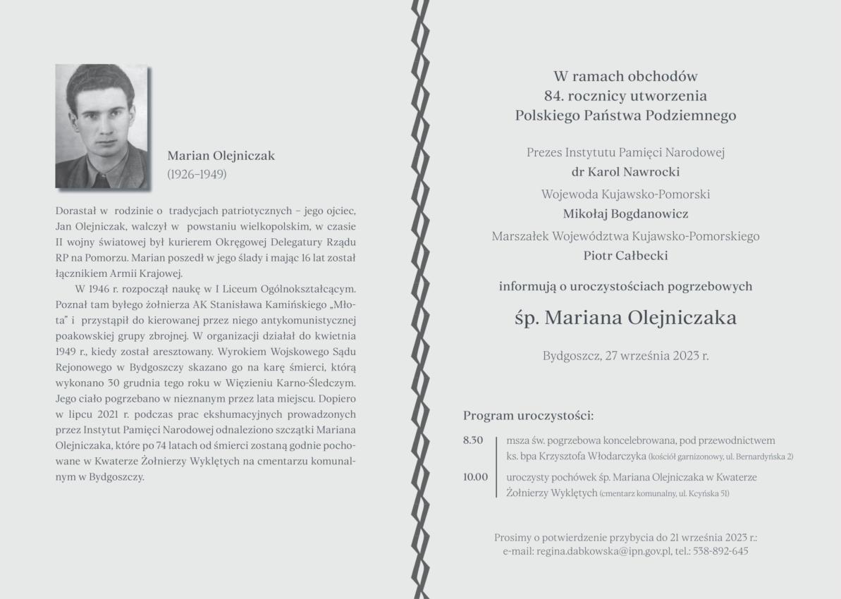 Uroczystości pogrzebowe Mariana Olejniczaka rozpoczną się w kościele garnizonowym przy ul. Bernardyńskiej 2, gdzie o godzinie 8.30 odbędzie się msza św. pogrzebowa koncelebrowana.