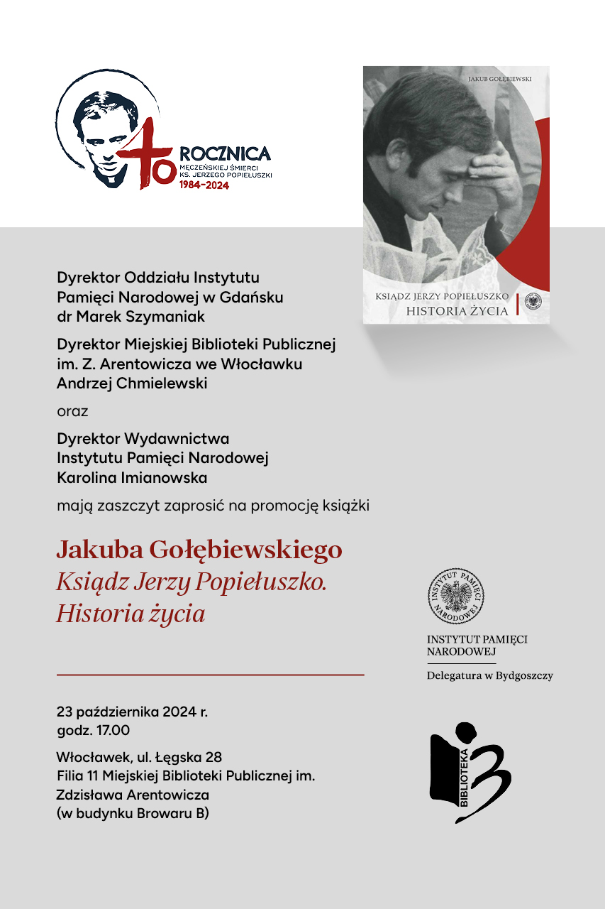 23 października 2024 r. w filii 11 biblioteki Miejskiej Biblioteki Publicznej we Włocławku, w budynku Browaru B, odbyła się promocja książki Jakuba Gołębiewskiego „Ksiądz Jerzy Popiełuszko. Historia życia”. W promocji oprócz autora udział wziął także ks. Jan Sikorski, ważna postać warszawskiej „Solidarności”. Spotkanie prowadził dr Krzysztof Osiński, pracownik Delegatury IPN w Bydgoszczy.