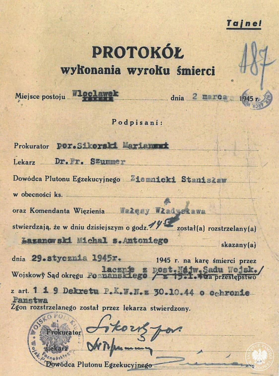 2 marca 1946 roku w Więzieniu Karnym we Włocławku wykonano wyrok śmierci na kapralu Janie/Michale Łazanowskim ps. „Graba”, żołnierzu podziemia antykomunistycznego. „Moja mogiła to Kujawy” – napisał w liście pożegnalnym.